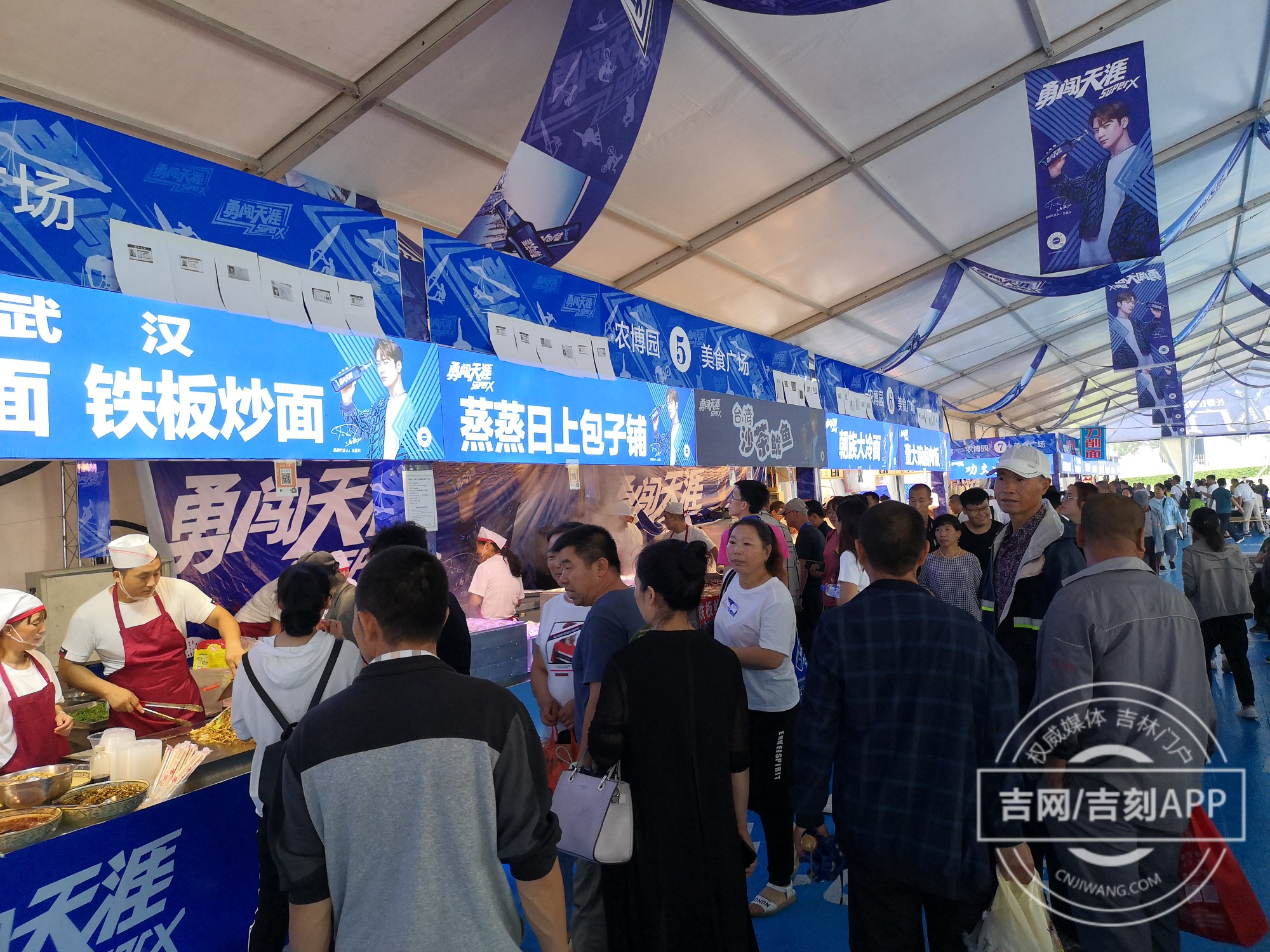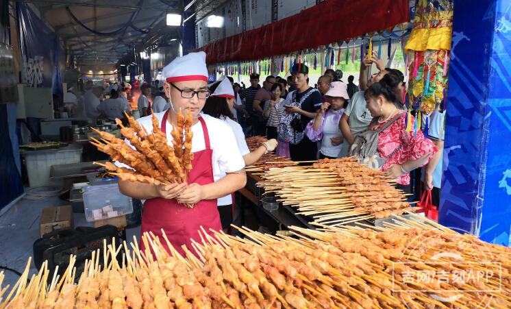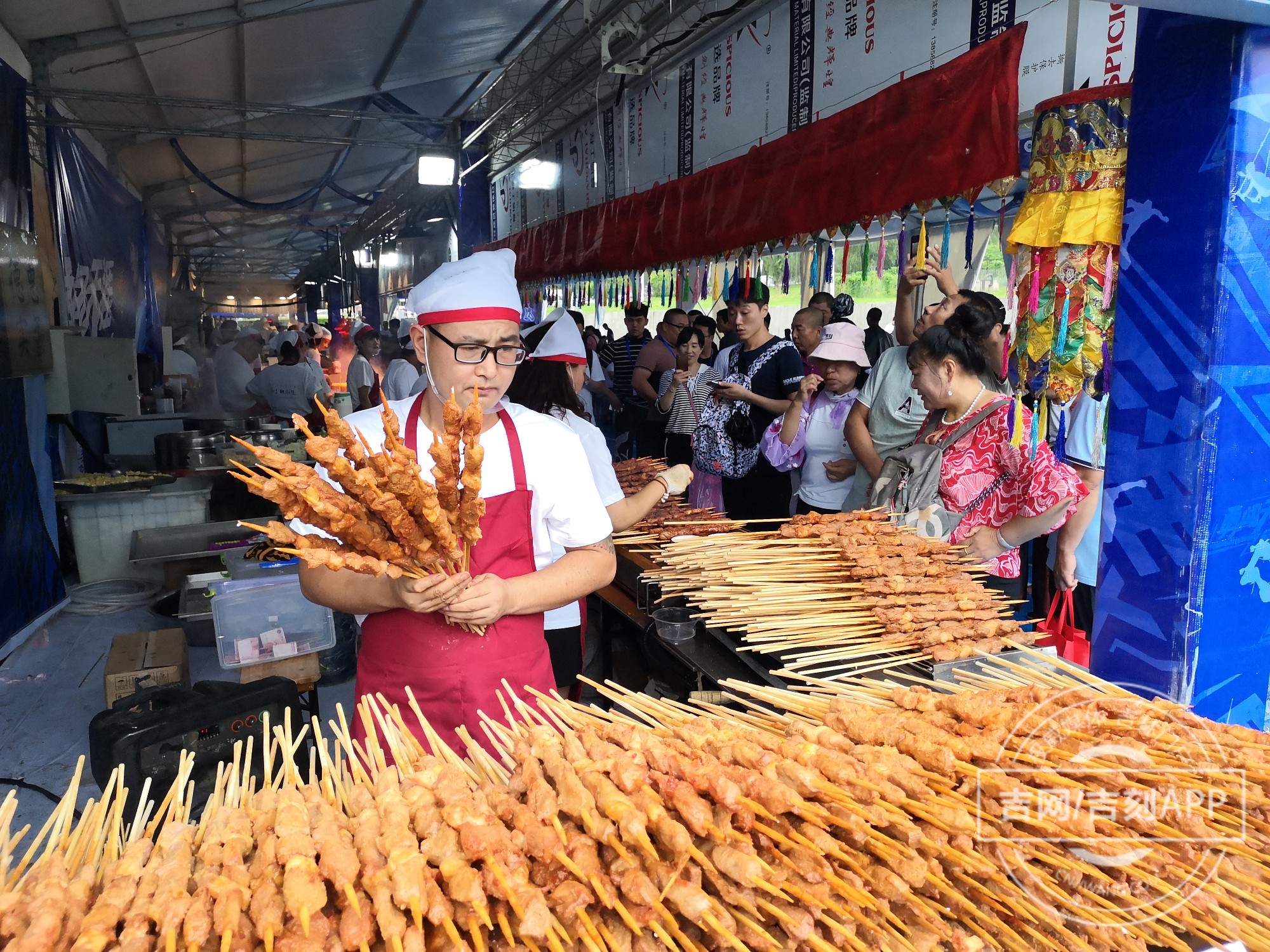 2019-08-16 10:18越泓鸣美食一条街,动感的音乐,精彩的舞蹈,一边跳一边烤,吸引着众多游园的游客。
