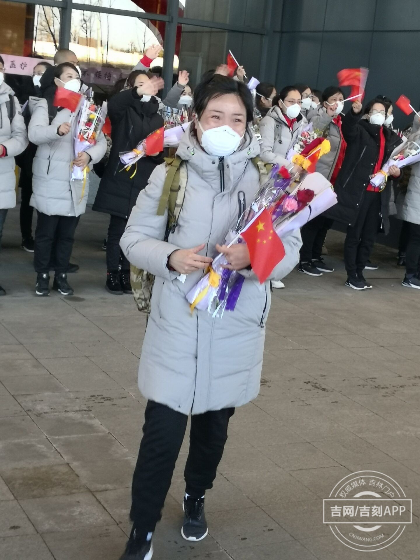 2020-03-28 07:35杨春红 越泓鸣欢送吉林医疗队的志愿者。