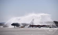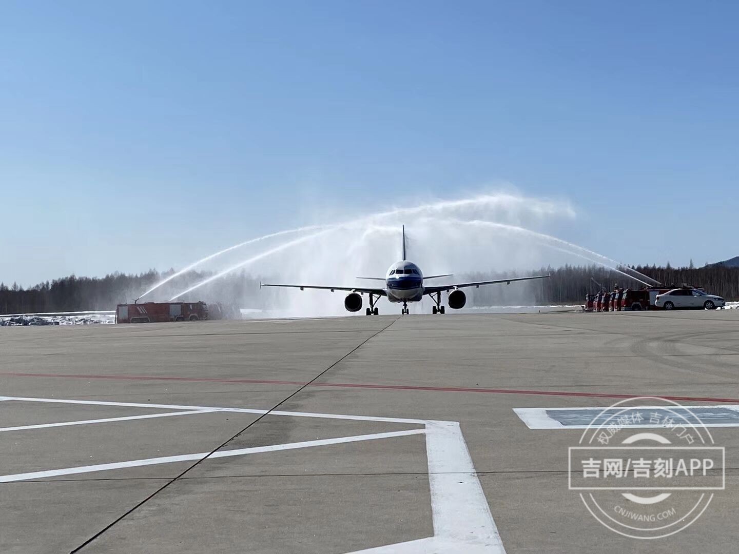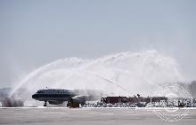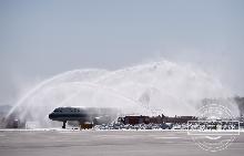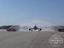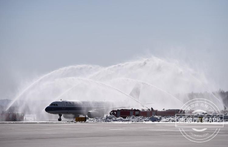 2020-03-28 14:11李易书第二架抵达长白山机场的飞机“过水门”。