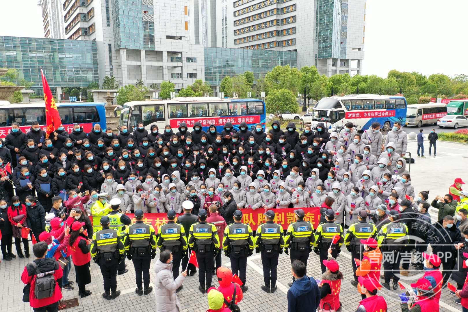 2020-03-28 08:09吉刻齐智 越泓鸣吉林省支援武汉方舱医院医疗队短暂的欢送仪式后即将出发武汉天河机场,等待与其他返吉的医疗队汇合。