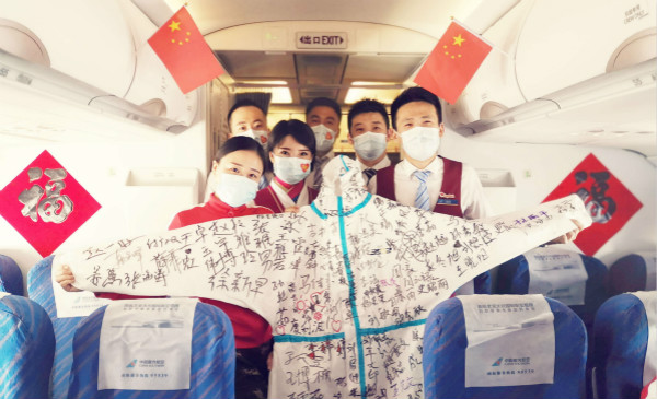 2020-03-28 14:20张昕莹 越泓鸣机组人员为返吉医疗队员准备了鲜花,欢迎他们回家!