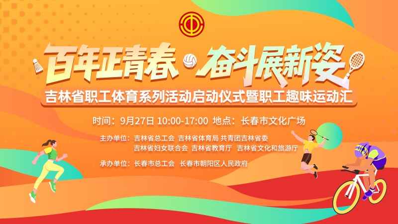 为庆祝中华全国总工会成立100周年,深入贯彻落实国家关于促进体育消费、推进体育产业高质量发展的精神,9月27日,吉林省总工会联合多家单位在文化广场,共同举办职工户外体育盛会。这是一场属于全省职工的体育嘉年华,是对百年工运事业的深情献礼!诚邀您锁定直播,共同见证活力吉林、奋进职工的时代新姿!